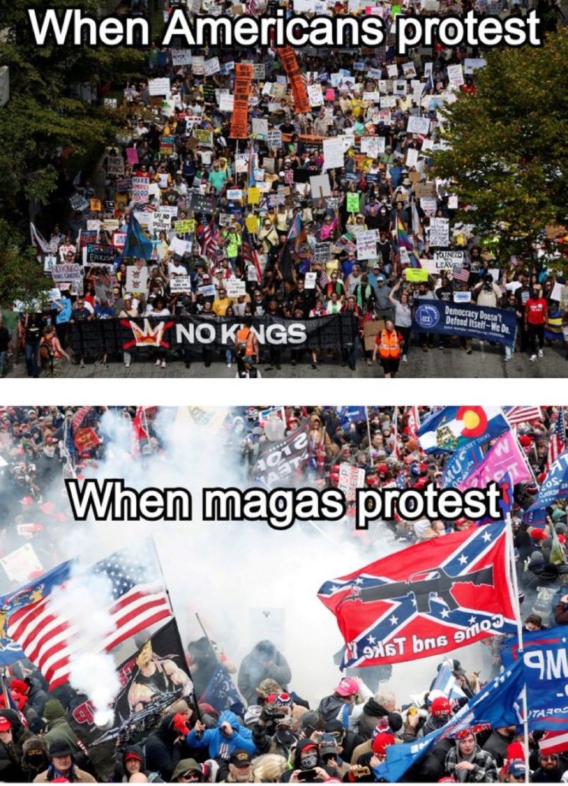 Во второй половине октября по всей территории США в сотнях городов прошли акции протеста против Трампа под лозунгом No Kings («Нет королям», «Без королей»). В качестве символа участники использовали флаг времен Войны за независимость США. Трампа изображают не просто как неадекватного автократа, а как нечто вроде реинкарнации короля Георга III, против которого американцы боролись за свободу. В протестах против «короля Трампа» и ужесточения миграционной политики приняли участие более 7 миллионов человек — на 2 миллиона больше, чем в июне.