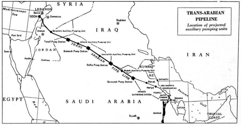 Речь идет не только об ответвлении к порту Триполи в северном Ливане протяжённостью порядка 550 км, но и о Трансаравийском нефтепроводе длиной 1216 км, проложенном из Саудовской Аравии в 1940-х годах. Он проходит через юг Ирака, Иорданию и южную Сирию и заканчивается в порту Сайда на юге Ливана.