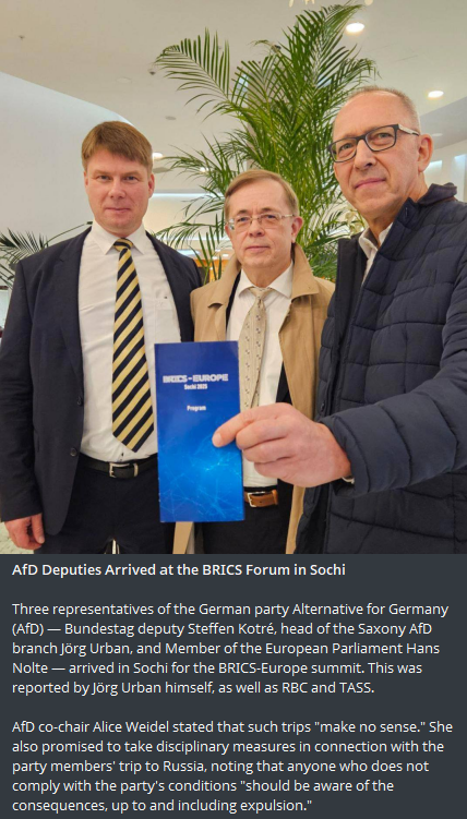 Именно приезд последних вызвал самый заметный скандал в Европе. Речь идёт о представителях оппозиционной и сегодня самой популярной в ФРГ партии – «Альтернатива для Германии» (АдГ). Среди участников форума в Сочи были депутат бундестага Штеффен Котре, руководитель саксонского отделения АдГ Йорг Урбан и депутат Европарламента Ганс Нойхофф.