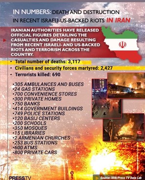Западные СМИ игнорировали смертоносные беспорядки и поджоги иранских городов, ссылаясь на данные финансируемых американским правительством НПО. Израильская разведка «частично признала свою причастность к смертельным беспорядкам, опубликовав 29 декабря в Twitter/X [заблокирована в РФ] сообщение, что её агенты были «на виду» у протестующих. «Моссад» не только взял на себя ключевую роль в январских беспорядках по всей территории Ирана, но и получил признание со стороны бывшего директора ЦРУ Майка Помпео, который в Twitter/X написал: «С Новым годом каждого иранца на улицах, а также каждого агента «Моссад», шагающего рядом с ними…»»