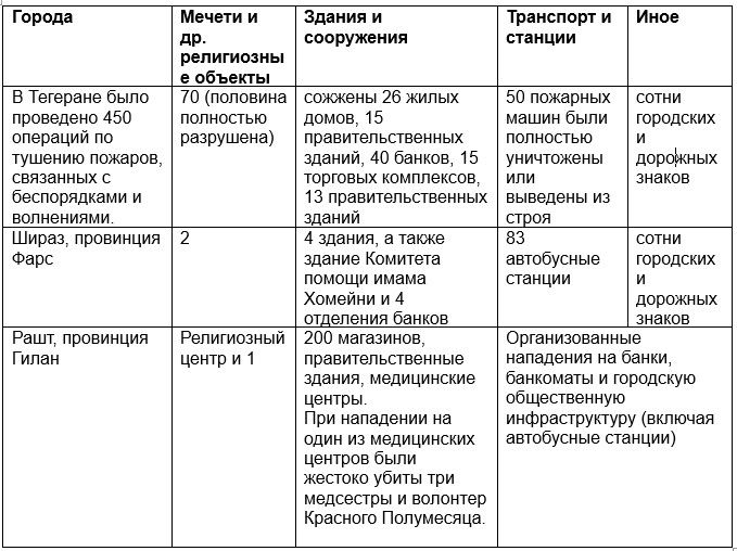 После 8–9 января «торговцы» и «мирные демонстранты» (как описывают их западные СМИ, на деле же террористы) всё чаще применяли коктейли Молотова, а также холодное и огнестрельное оружие. Ситуация в Иране обострилась из-за действий повстанческих групп, включая национальные меньшинства. Официальные лица страны оценивают общий материальный ущерб более чем в 125 миллионов долларов, включая разрушения в свыше 20 городах.