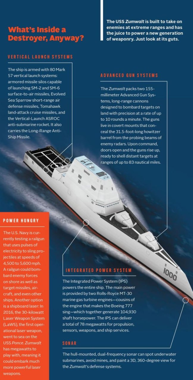 Планировалось также оснастить эсминец-невидимку электромагнитной рельсотронной пушкой. Для этого корабль получил мощную энергетическую установку — два газотурбинных двигателя Rolls-Royce MT30 и два вспомогательных турбогенератора. Однако во время стрельбы из такого оружия необходимо полностью отключать остальные системы корабля. Кроме того, вести огонь с полностью неподвижного и «слепого» корабля с технической точки зрения было крайне опасно, поэтому эту идею быстро отвергли.