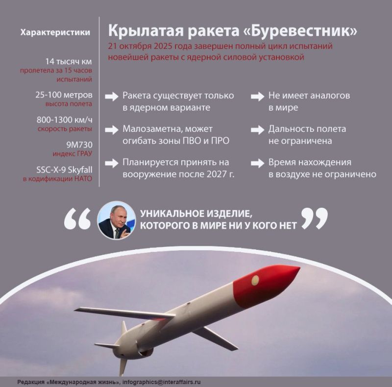 Ранее газета The Wall Street Journal сообщила, что наличие «Буревестника» может предоставить России преимущество на потенциальных переговорах с США по контролю над вооружениями, поскольку ракета представляет угрозу для американской системы ПРО «Золотой купол».