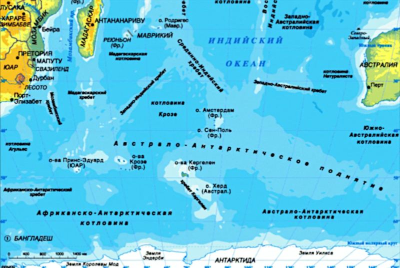 Ещё более масштабная экономическая зона Франции — не менее 770 тыс. кв. км — расположена юго-восточнее указанных районов, на юге Индийского океана, где находятся острова Кергелен (7200 кв. км), Новый Амстердам, Сен-Поль и Круазо (между ЮАР и Австралией). Здесь также выявлены нефте- и газовые ресурсы, однако их объем примерно в 2,5 раза меньше ранее упомянутых. Территориальное и ресурсное значение этих владений повышает геополитическую и экономическую роль Франции в обширном регионе, что подтверждается, например, третьим местом страны в мире (после Китая и Индонезии) по объёмам рыбных запасов, имеющихся и осваиваемых…