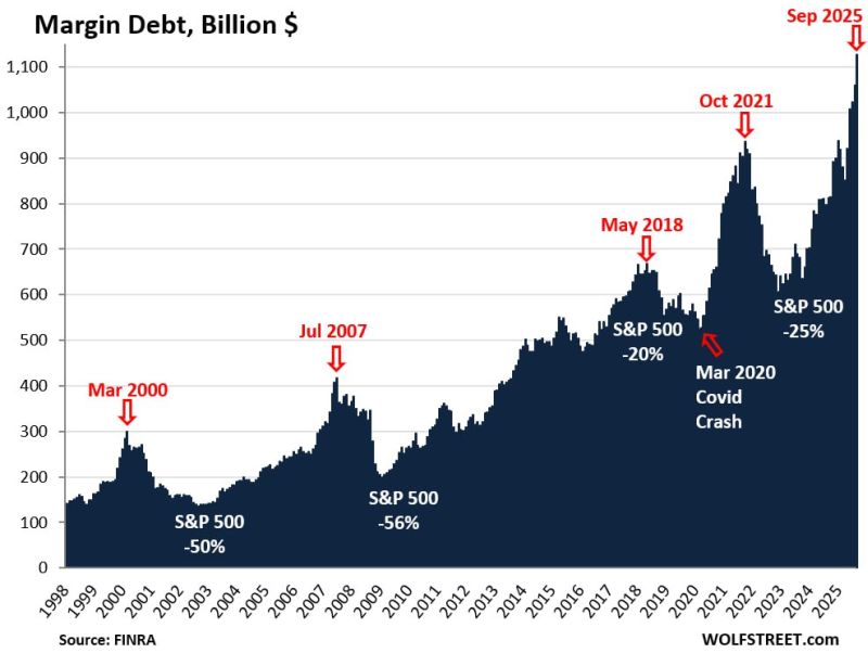 «Многократные резкие скачки маржинальной задолженности, вперемешку достигая новых максимумов, свидетельствуют о чрезмерной спекулятивной активности и высоком риске, что неизменно ведёт к внезапным обвалам. Все говорят о пузыре искусственного интеллекта, но таков взгляд по шкале кредитного плеча — и это пугает: стремительное наращивание рисков и спекуляций на рынке, о чём говорят рекордные показатели маржинального долга, создаёт серьёзные уязвимости», отмечает известный финансовый аналитик Вольф Рихтер.