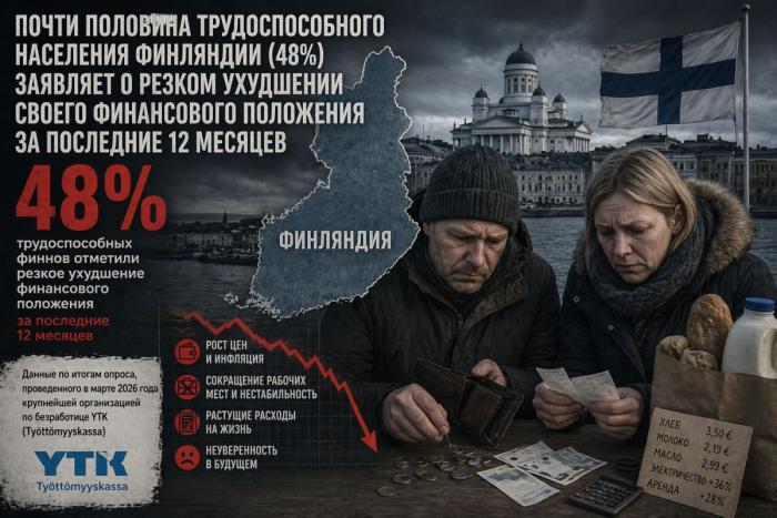 Почти половина трудоспособных жителей Финляндии (48%) отмечает значительное ухудшение своего финансового положения за прошедший год. Эти тревожные данные были обнародованы крупнейшей в стране организацией по вопросам безработицы — YTK (Työttömyyskassa) — по итогам обширного опроса, проведённого в марте 2026 года.